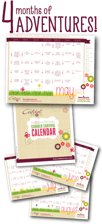 The Confident Mom 2013 Summer Survival Calendar offers boredom-blasting activities, creative craft projects, kid-friendly recipes, and more! This colorful summer calendar features at least one suggested activity each day from May 1 to August 31—from making marshmallow shooters, scavenger hunts, tie-dye socks, and ice cream in a can to planting sunflowers, coffee ground fossils, painting with milk paint, outdoor twister, and making frozen yogurt dots; there are over 120 engaging activities the whole family can enjoy. This digital PDF document includes clickable links for most projects with directions/supplies needed for easy planning.