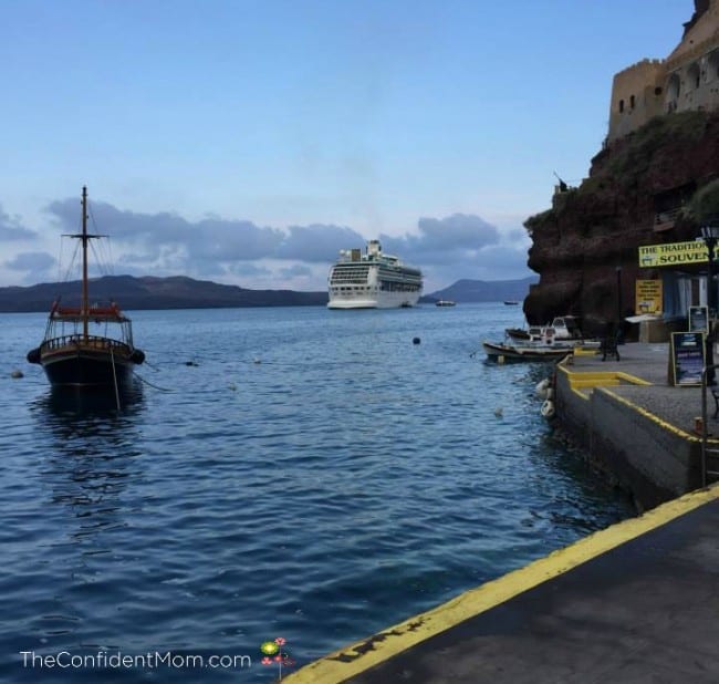 Once in Santorini we took a cab to the cable car station, took a ride down on a cable car and then took a tender to our ship. (All this while carting our luggage!)